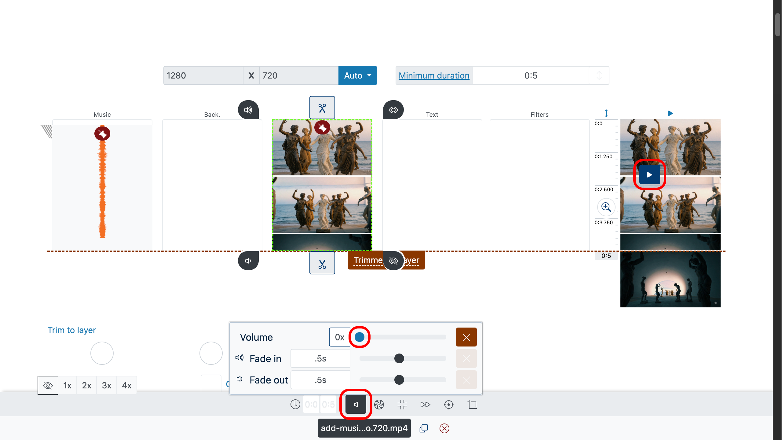 Gunakan parameter volum untuk merendahkan muzik latar dan menyerlahkan audio utama (dialog, bunyi penting pada adegan). Rendahkan muzik supaya ia menyokong adegan tanpa bersaing dengannya.